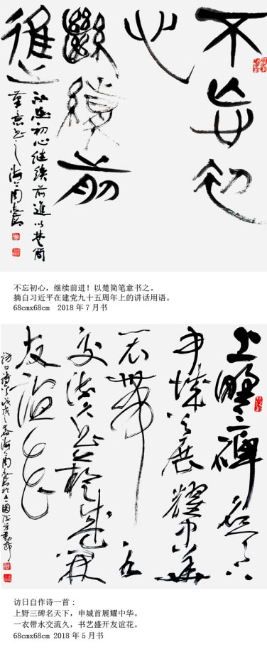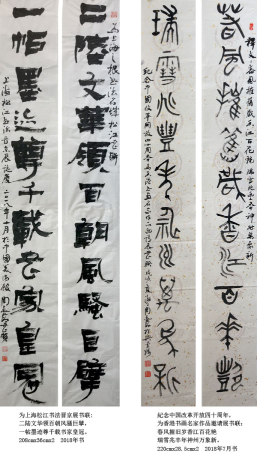兼书各体,尤精行草。作品参加一至十一届国展,及数十次海内外重大书展,被海内外数十家博物馆、美术馆、纪念馆收藏。多次出访、办展于港、澳、台地区亚、欧、美、澳州等十数国。2013年6月,应邀为北京人民大会堂和八一军委大楼创作丈二及八尺郑板桥《咏竹》诗二首书法作品。2015年9月2日晚在钓鱼台国宾馆,习近平主席宴请出席中国人民抗日战争暨世界反法西斯战争胜利七十周年活动的国际贵宾之“请柬、节目单、节目简介、菜单"封面字均出其手笔。2017年11月,一带一路中华文化走出去全球艺术巡展,中、马(马来西亚)两国艺术展,中国代表团为团长。2018年4月18日,为纪念中日和平友好条约签订40周年,率上海书画家代表团参加第28回全日中国际美术大展,並向出席大展的前日本首相,对中日友好作出贡献的94岁高龄的村山富市赠送“长乐永康”书法作品。