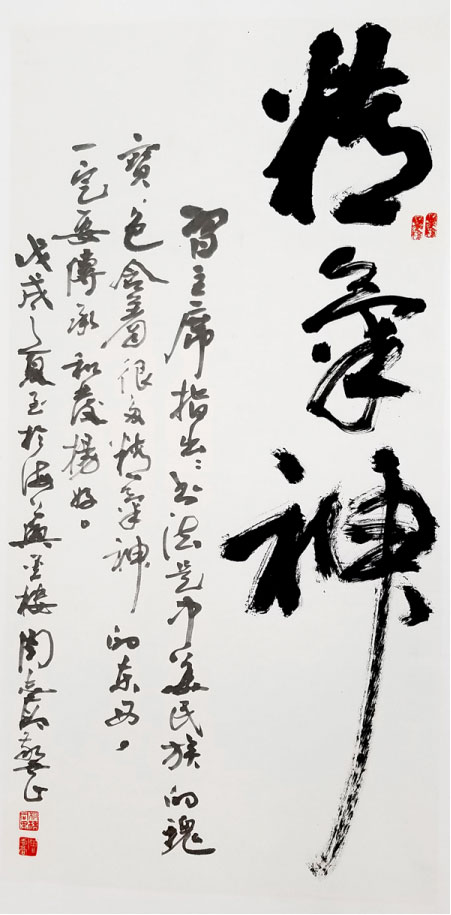 精气神(习总书记2014年5月30日看望北京民族小学师生时讲话摘句);书法是中华民族的瑰宝,包含着很多精气神的东西,一定要传承和发扬好。138cm×68cm 2018年7月书