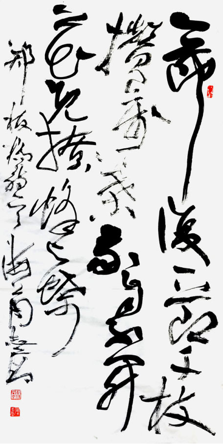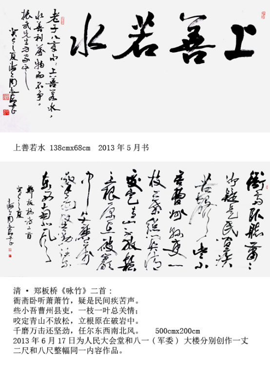 郎绍君:周先生的作品洋溢着强烈的主观色彩和深刻的人文气息,优雅而潇洒,灵动而俊朗,大气磅礴,顾盼生情,气韵贯通。尤其他的草书,翩若惊鸿,矫若游龙,落笔即见风骨,即显神采,给人一种极富流动感的视觉和心理冲击。既体现出他深刻的书法个性,又具有深厚的文化底韵,这是一种具有民族意识的“大书法”,实为大家风范。