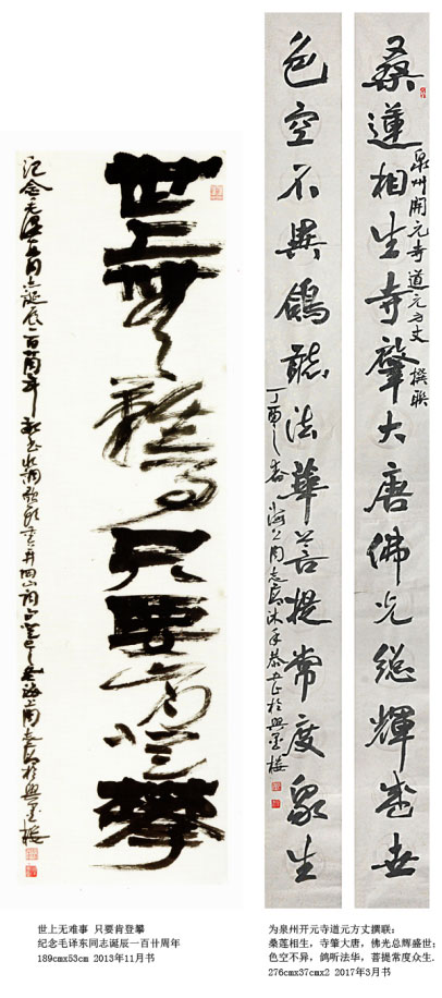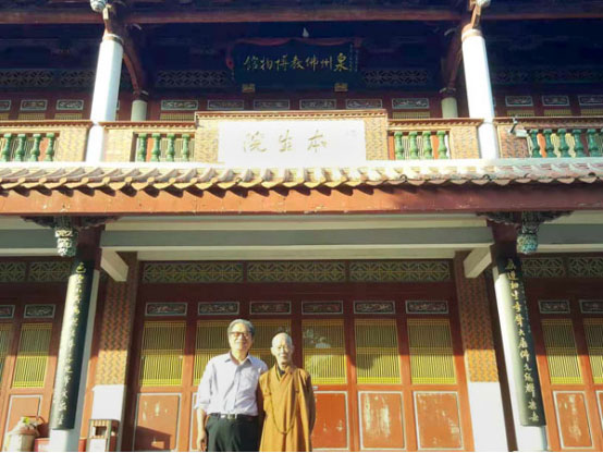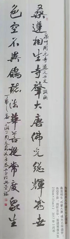 2019年11月6日,在中央国台办的指导下、《神州杯海峡两岸书画大赛》作品评审在福建泉州举行、上海市书协名誉主席、上海中国书法院院长周志高应邀为书法评审组召集人、在顺利完成评审任务后、来到弘一法师当年所在的开元寺、与85岁高寿住持道元方丈、在上匾赵朴初书泉州佛教博物馆下、在两边悬挂三年前周志高所书写的楹联中间合影留念。