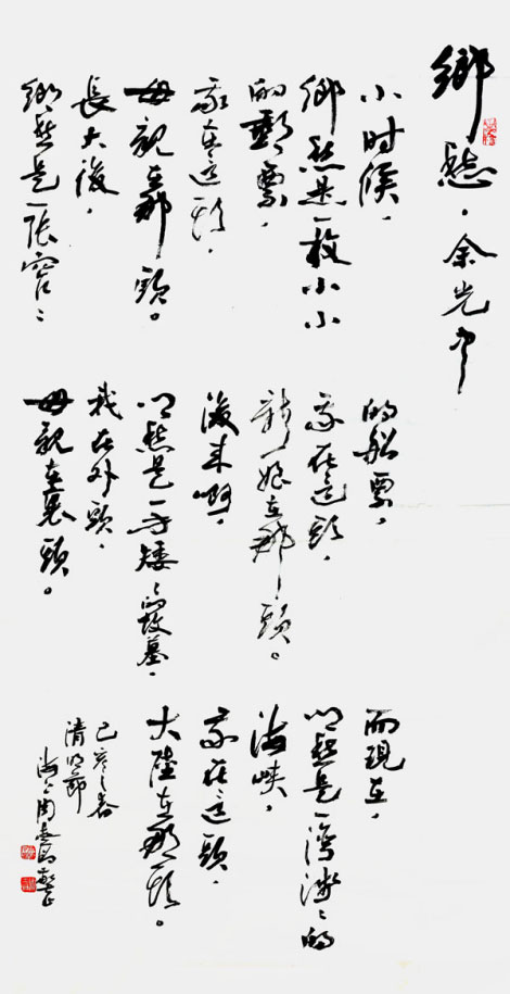 台湾诗人余光中《乡愁》小时候,乡愁是一枚小小的邮票,我在这头,母亲在那头。长大后,乡愁是一张窄窄的船票,我在这头,新娘在那头。后来啊,乡愁是一方矮矮的坟墓,我在外头,母亲在里头。而现在,乡愁是一湾浅浅的海峽,我在这头,大陆在那头。68cm×138cm 2019年4月书