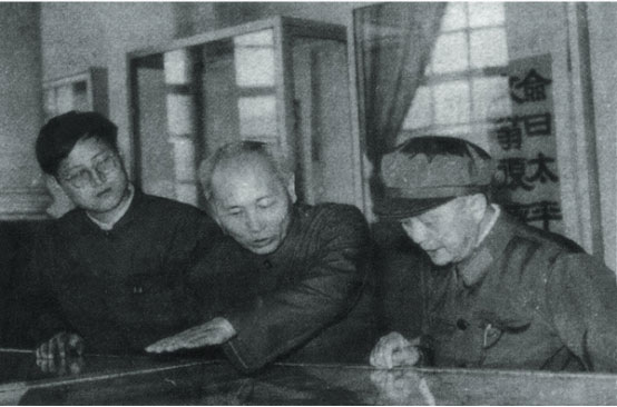 1980年5月11日,全国第一届书法篆刻展览在沈阳开幕。图为12日中国书协筹委会主任舒同右一在馆长杨仁凯中和周志高左一陪同下参观辽宁博物馆展品。