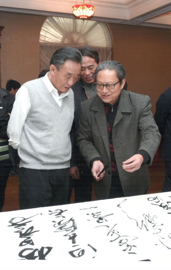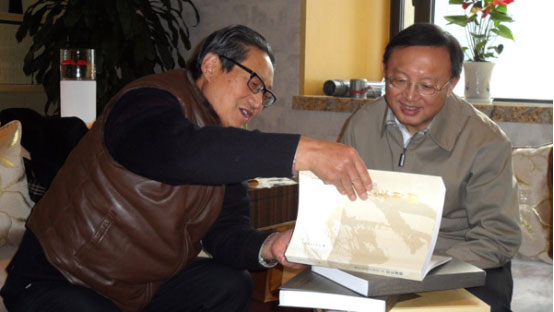 2012年1月22日除夕下午,与中华人民共和国外交部长、著名书法家杨洁篪切磋书艺。图为向杨部长介绍十届国展和《海派书法---百年百家作品集》。