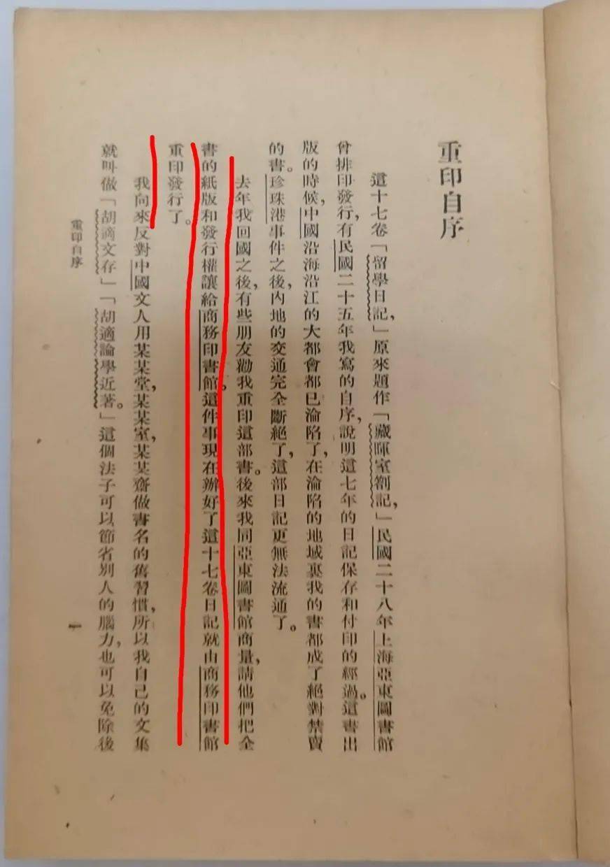 而在商务版胡适所撰的重印自序中,胡适写道:去年我回国之后,有些朋友劝我重印这部书。后来我同亚东图书馆商量,请他们把全书的纸版和发行权让给商务印书馆,这件事现在办好了,这十七卷日记就由商务印书馆重印发行了。