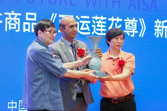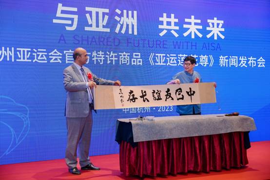 《亚运莲花尊》首发揭幕后,主办方将《亚运莲花尊》以及朱炳仁大师现场亲笔手书《中巴友谊长存》,赠予巴基斯坦驻华大使馆新闻处首席新闻官阿斯加尔•穆罕默德收藏。以表达对杭州亚运的期盼与铭记,并诚挚向巴基斯坦发出邀请,欢迎更多的巴铁工美艺术家巴铁艺人来杭交流互动,共同见证荣耀。阿斯加尔•穆罕默德对收藏《亚运莲花尊》表达了感谢,他表示,《亚运莲花尊》高度凝聚了中国的传统文化,是具有文化价值和艺术品质的作品。同时也对收藏朱炳仁大师书法作品《中巴友谊长存》表示感谢。活动中,他认为中巴友谊长存,中巴文化交融互通的历史更加悠久,《亚运莲花尊》作为精美的中国非遗作品,对促进国际文化交流互通非常有意义。