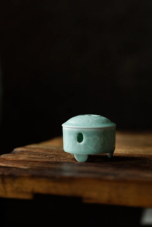 这是只景德镇湖田窑香炉,影青,半掌大小,造型并不奇崛,炉底三枚圈足鼎立,圆融和顺,既端庄又婉丽。
