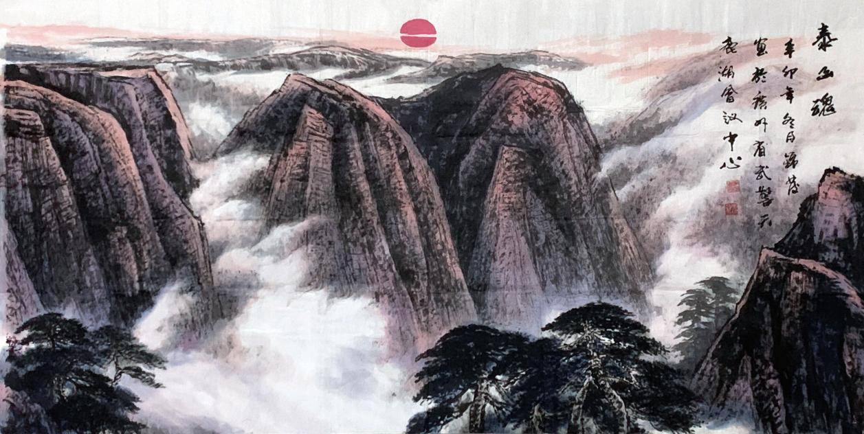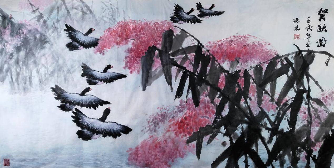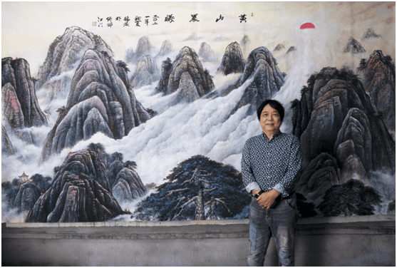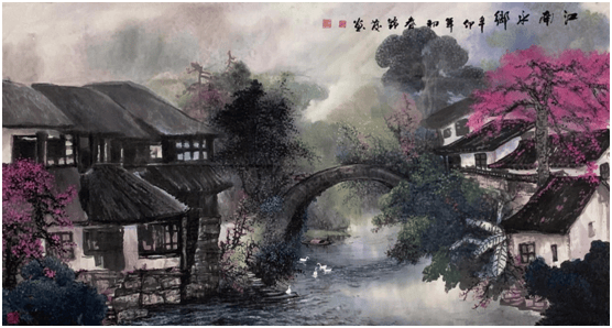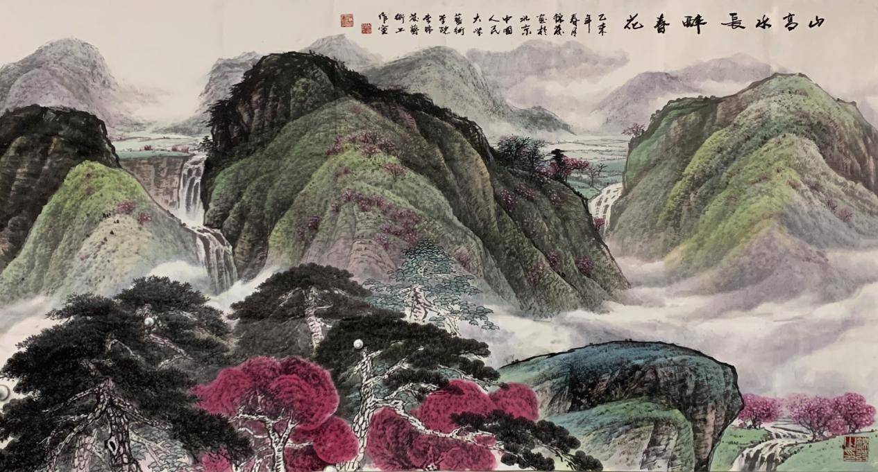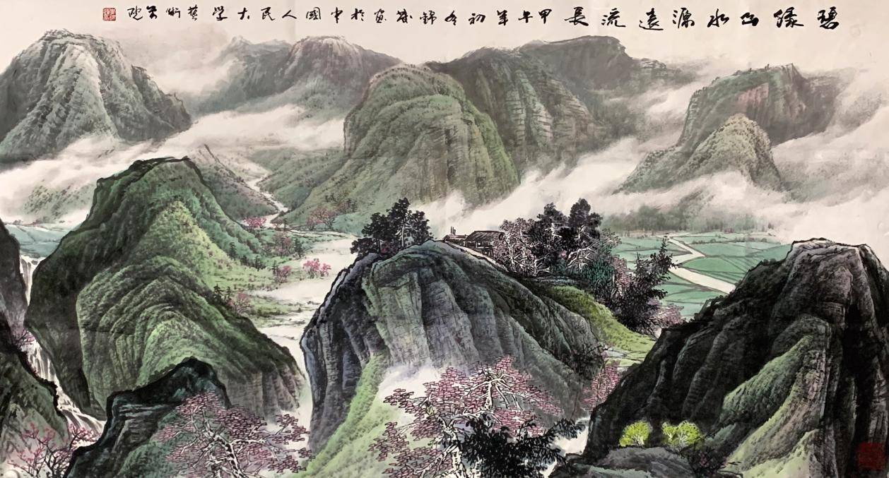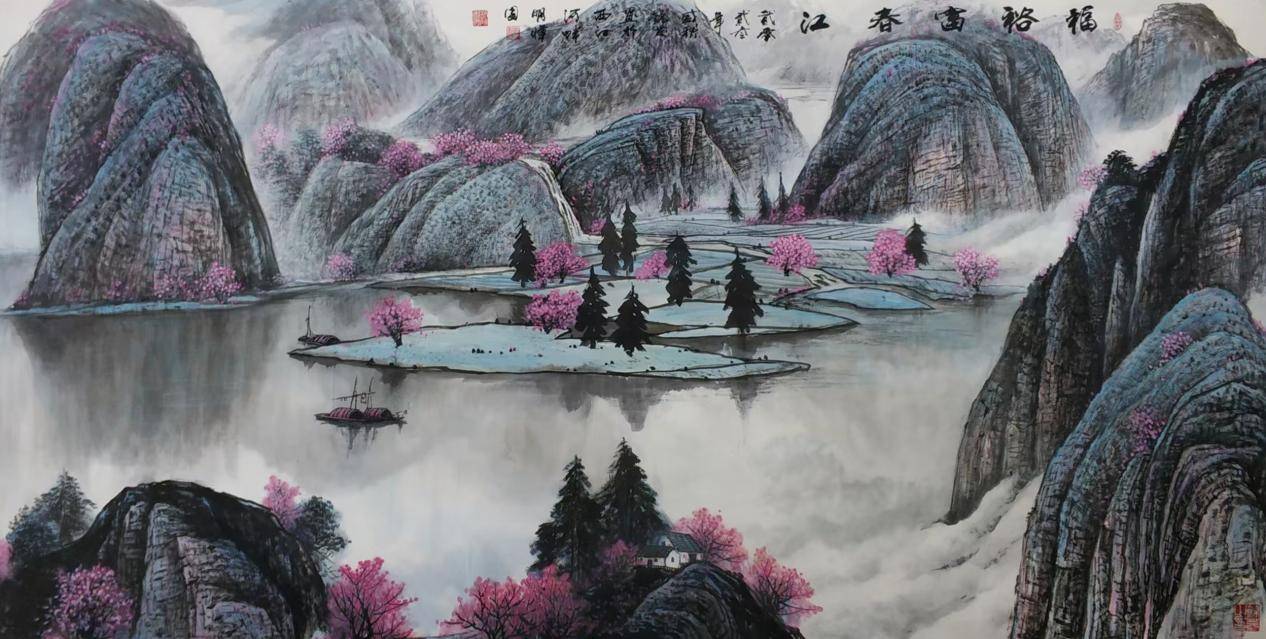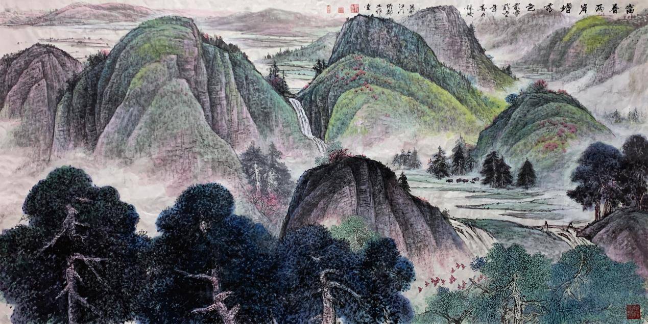 他的山水画常以雄浑山川为题材(如《锦绣山河》《秋意太行颂》),笔法上继承传统青绿山水的皴擦技法,又融入西画的光影层次感,使山峦既有“骨法用笔”的苍劲,又有墨色晕染的朦胧意境。例如《润泽江南》中,他以细腻的笔触勾勒水乡民居,搭配淡彩泼墨表现烟雨朦胧,将传统“水墨写意”与现实场景结合,呈现出“诗中有画”的抒情性。