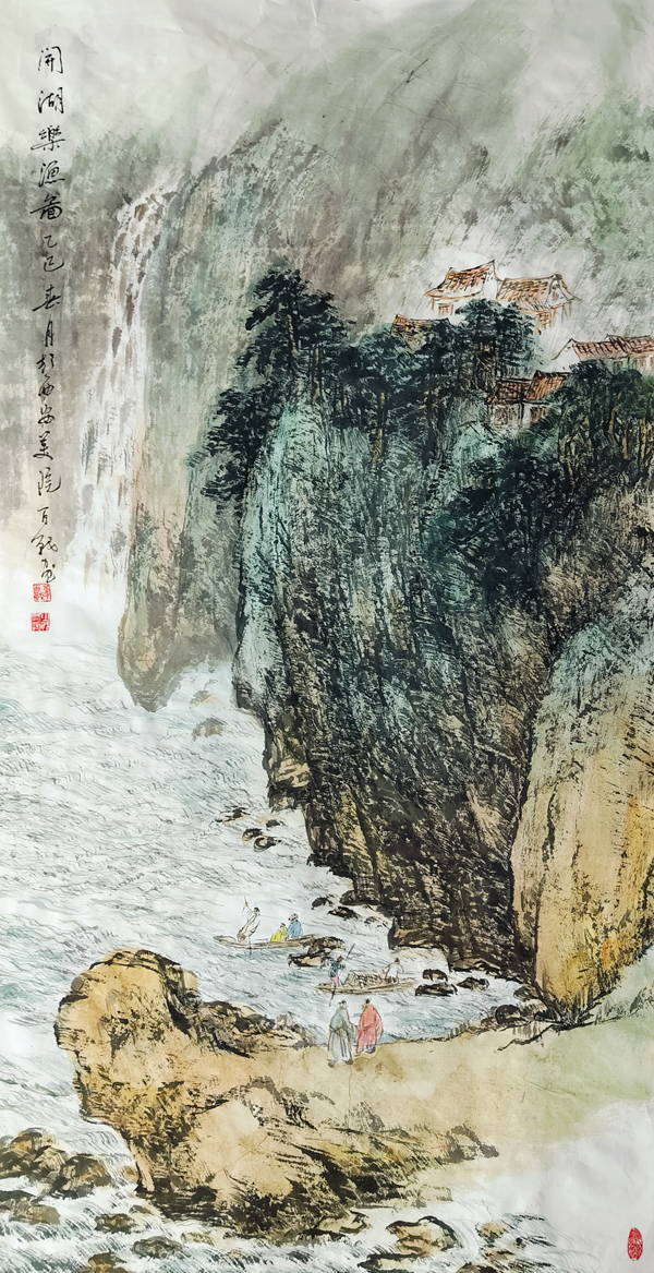 设色淡雅而不铺张。山势峻峭而不孤芳。水波涟漪而不怒奔。这是画作吗?更像是他家。在不经意间被他破题了。看看下边这幅《金山银山家乡山》。