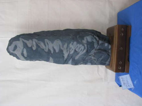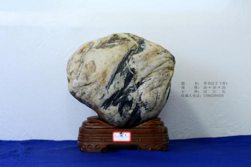 这方汉江奇石高42CM、宽32CM、厚15CM,为汉江金带石,呈黑底金黄字色(干拍呈黑白分色),石质细腻,石皮表面光滑,水洗度佳,黑白分明,对比、反差较明显,整个石头干净利落,天然形成中国汉字“丝”字。字体书法体味浓,此字右下巧妙的一笔呈峰回路转之势,把“丝”字单个字义引深为丝绸之路的文化内涵,并体现在一方石头上。“丝”字字体书写线条流畅、飘逸、灵动,似飘带、似流水,似风动、似云霞,惟妙惟肖,给人一种如诗如画的意境。题名《丝路》确切,文化内涵意义深远。