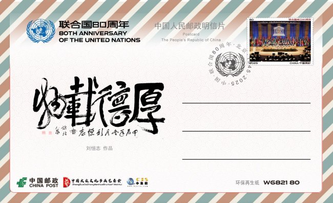 他的书法,是家国情怀的深情告白。从协助陈汉元创作《话说长江》,到担任《先锋颂》总撰稿获中宣部“五个一工程奖”;从创作海军军歌《走向深蓝》成为“走向深蓝”一词发明人,到谱写《战士·界碑·祖国》颂扬边防将士,刘恒志的艺术生涯始终与国家命运同频共振。这种家国情怀,自然也融入他的书法创作中。他多次为重大国家活动创作书法作品,为联合国成立80周年创作的《厚德载物》明信片,以东方哲思对话世界;2025年发行的《国礼艺术名家——刘恒志》邮票,将书法艺术作为国家名片推向国际。在这些作品中,他的笔墨既见“天下兴亡匹夫有责”的担当,又含“海纳百川有容乃大”的胸怀,让书法成为传递中国声音、彰显中国精神的重要载体。